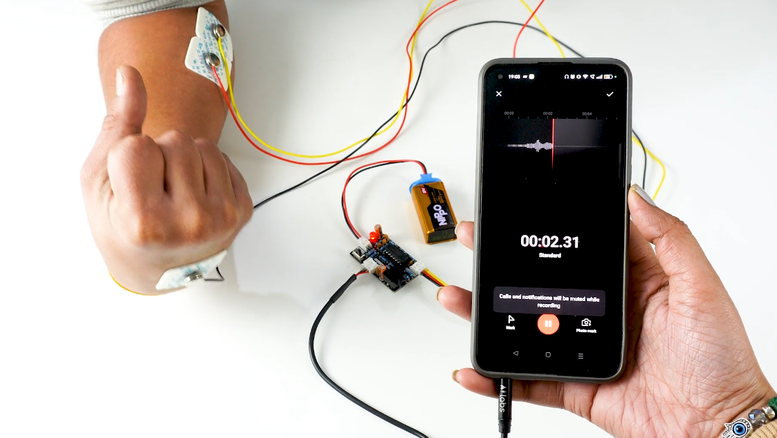 Ini adalah amplifier biopotensial portabel berukuran kecil dengan setup tanpa kode untuk merekam dan mendengarkan sinyal otot Anda (EMG) secara non invasif. Yang terbaik adalah bahwa itu tidak memerlukan mikrokontroler (seperti Arduino) untuk mengambil sampel sinyal. Anda hanya perlu mencolokkan baterai 9V ke papan, elektroda ke tubuh, dan jack audio ke ponsel/laptop, dan Anda siap merekam sinyal dari otot (EMG) menggunakan perangkat lunak seperti audacity atau aplikasi spike recorder Backyard Brain.