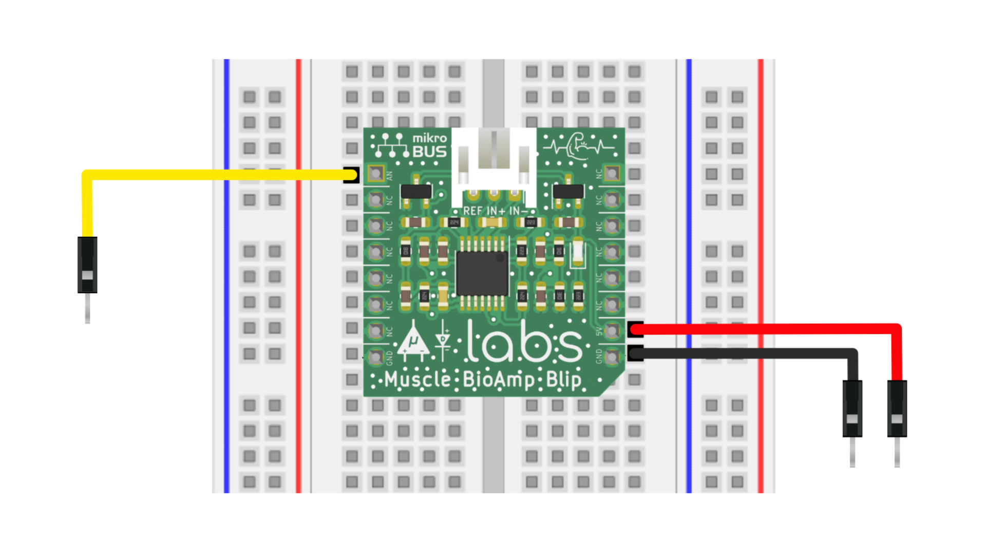 Jika Anda berpikir untuk menghubungkan lebih banyak komponen/sensor dan ingin mengintegrasikan Muscle BioAmp Blip dalam sirkuit lengkap maka akan lebih baik menggunakan breadboard. Pasangkan Muscle BioAmp Blip pada breadboard dan hubungkan kabel jumper (jantan ke jantan) di 5V, GND, AN.