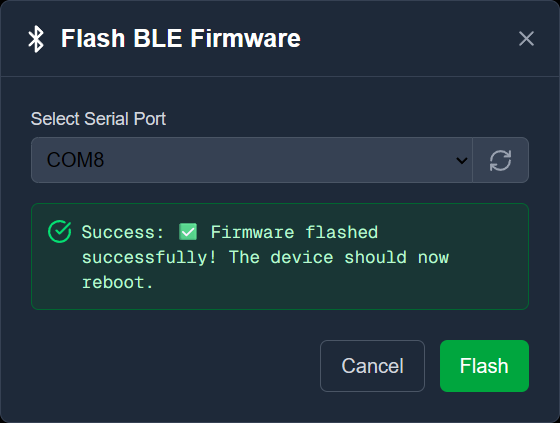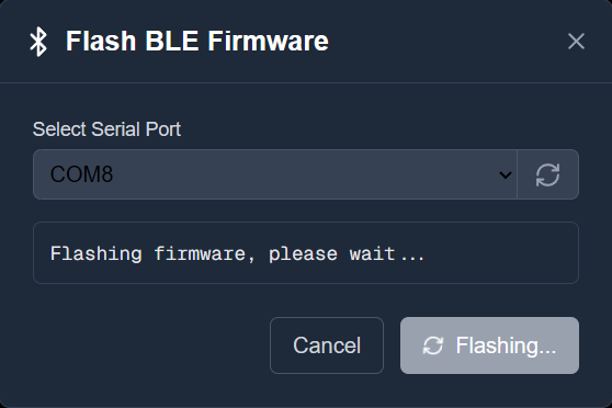 1. Klik Flash, tombol Flash untuk mulai mengunggah firmware BLE.