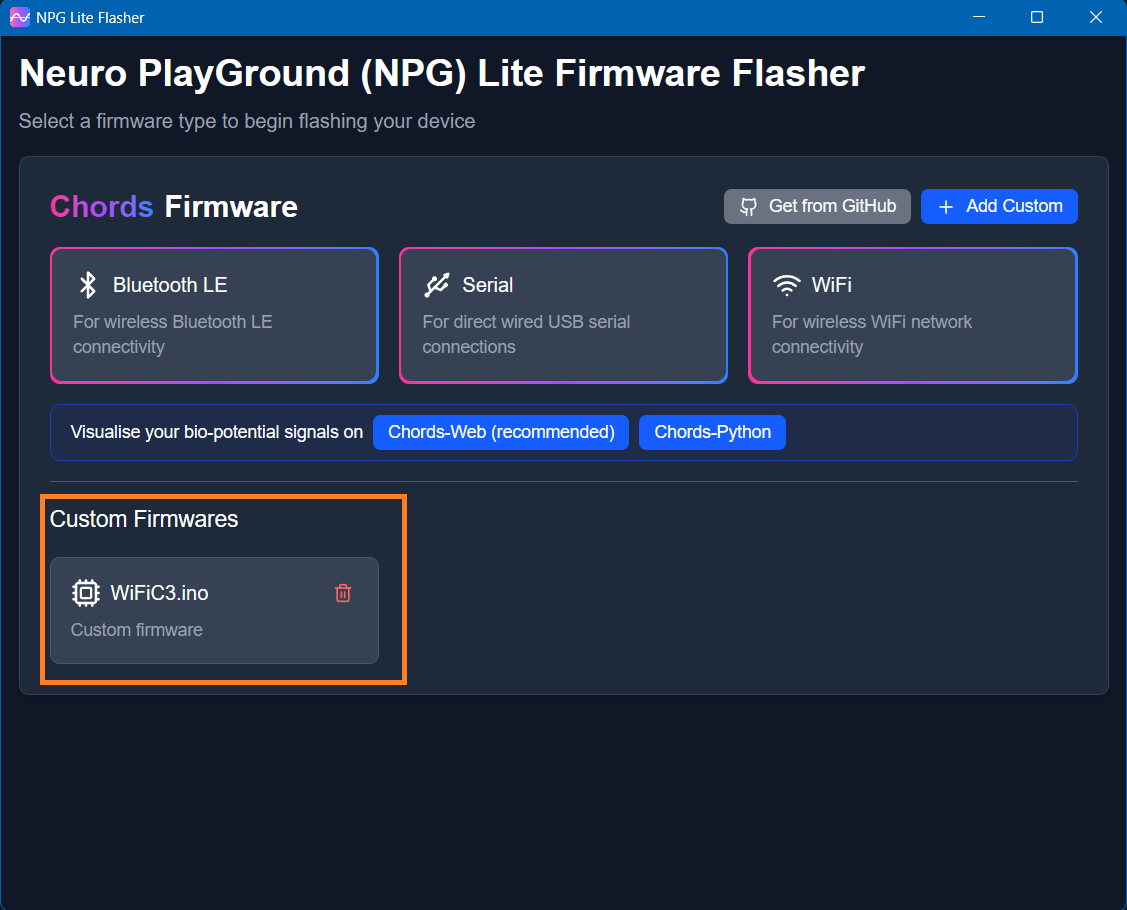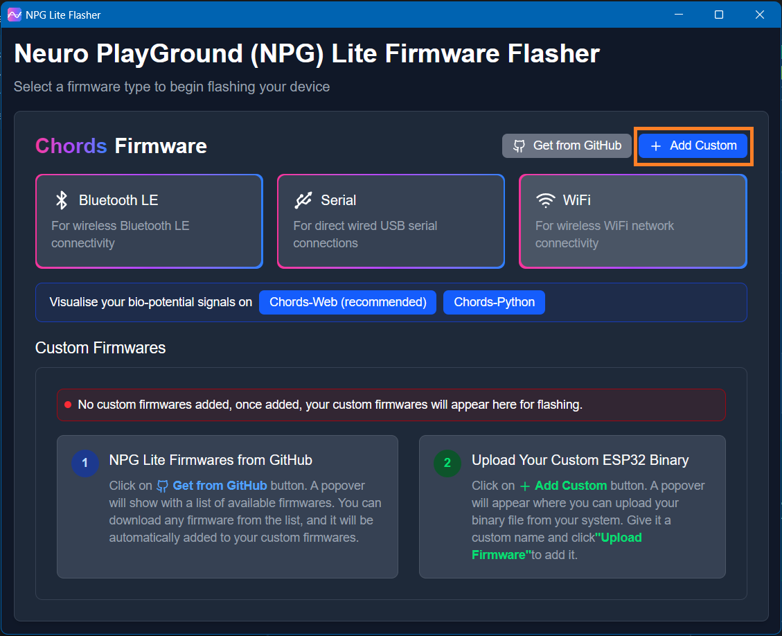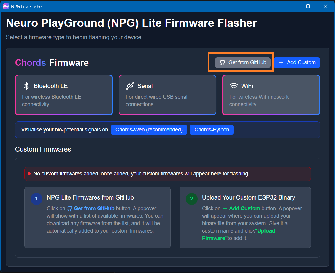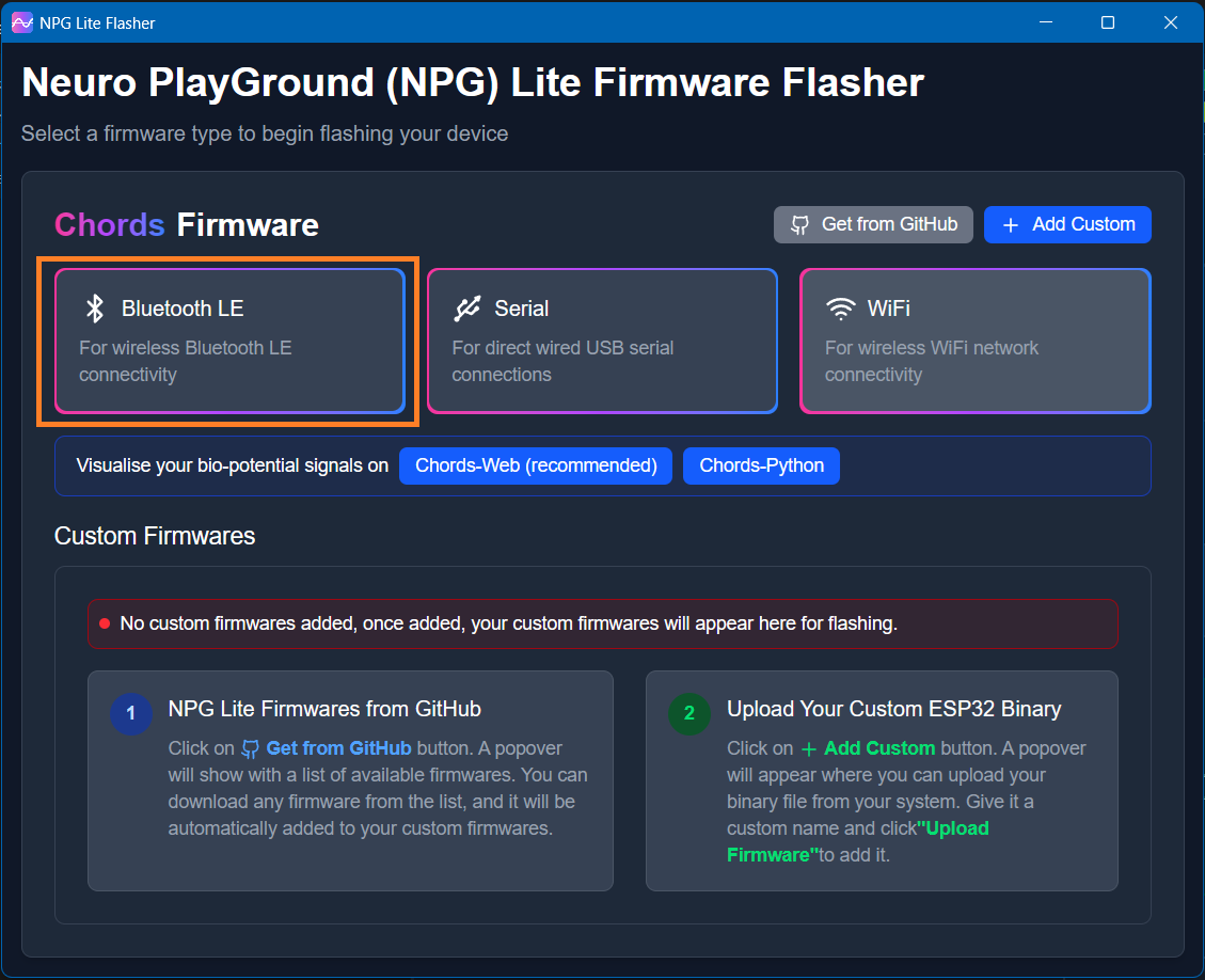 NPG Lite Flasher adalah aplikasi desktop open-source yang memungkinkan Anda untuk flash firmware ke Neuro PlayGround Lite, serta papan berbasis ESP32 lainnya menggunakan file biner. GUI yang dipoles (dan CLI) untuk mengunggah bundel firmware baru ke perangkat NPG Lite Anda (atau papan ESP32).