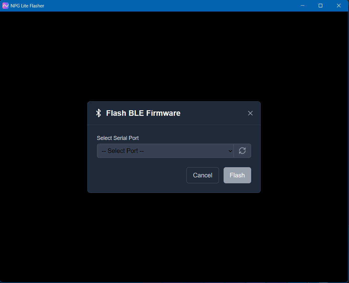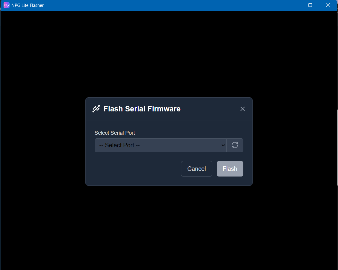 1. Hubungkan perangkat NPG Lite Anda via USB-C. Flasher harus mendeteksi port COM serial baru. Dari dropdown Port, pilih port yang sesuai dengan NPG Lite Anda.