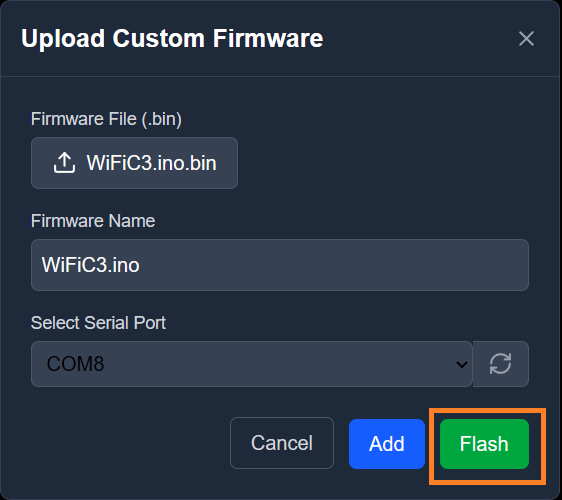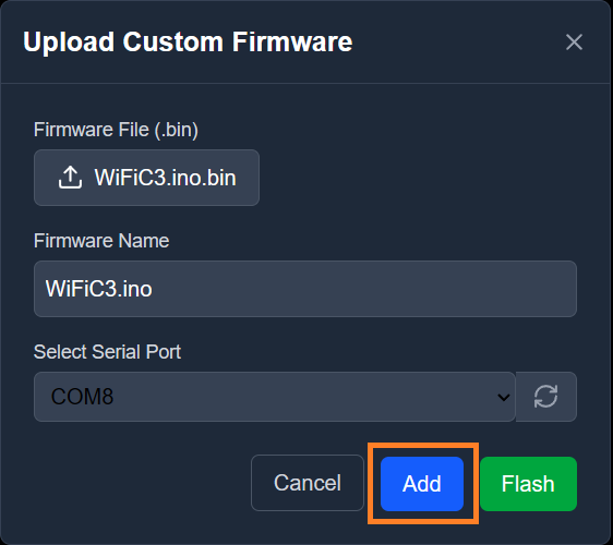 2. Klik Add, ini akan menambahkan firmware di daftar +Add Custom untuk flash di masa depan - sehingga Anda dapat melewati langkah pemilihan file lain kali.
