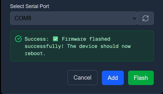 1. Tunggu konfirmasi, Anda akan melihat pesan “Success”. Ini menunjukkan bahwa firmware telah berhasil di-flash.