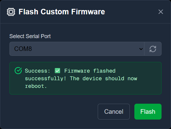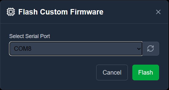 1. Setelah diunduh, layar Flash Custom Firmware akan muncul, klik Flash untuk flash firmware ke perangkat Anda. Pastikan perangkat NPG Lite Anda terhubung via USB-C. Flasher akan mendeteksi port COM serial secara otomatis. Anda juga dapat memilih port COM dari dropdown Port, sesuai dengan perangkat Anda.