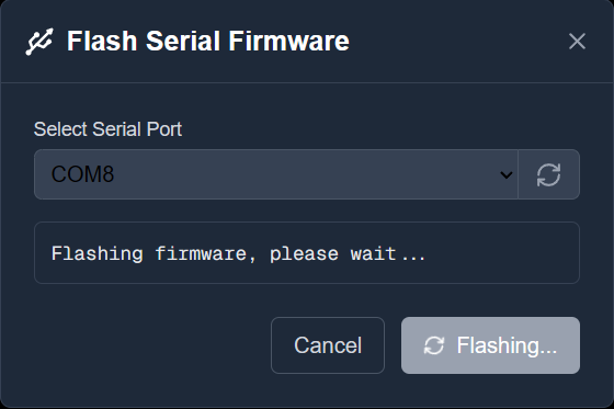 2. Klik Flash, tombol Flash untuk mulai mengunggah firmware Serial.