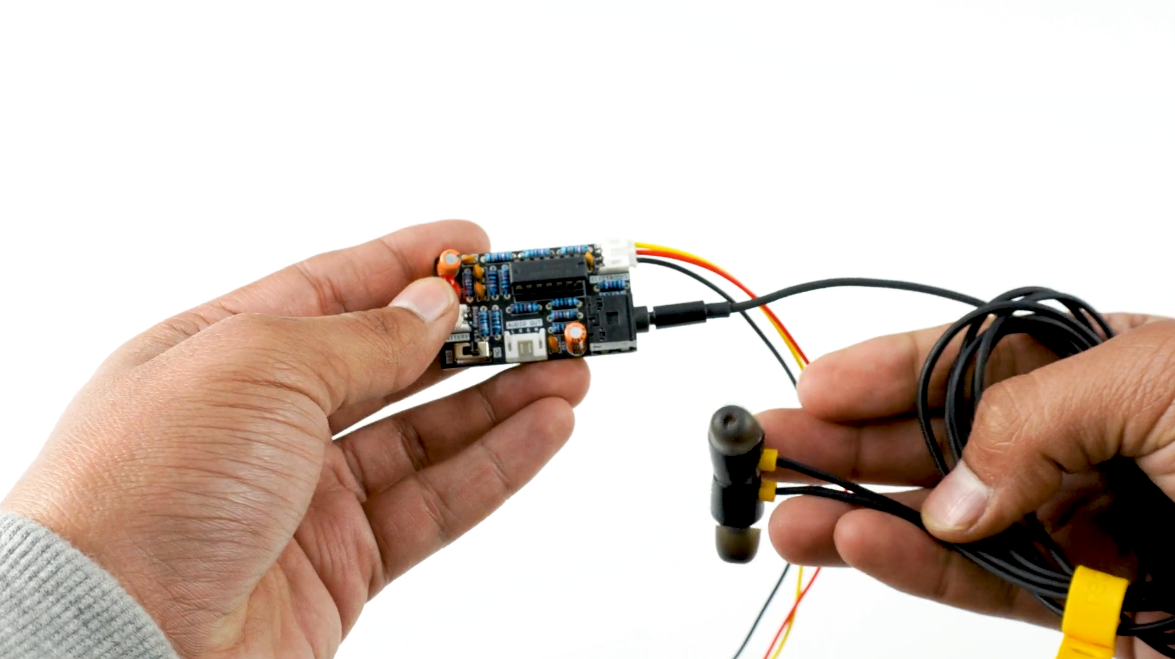 Pasang earphone atau headphone berkabel Anda di jack 3.5mm BioAmp v1.5.