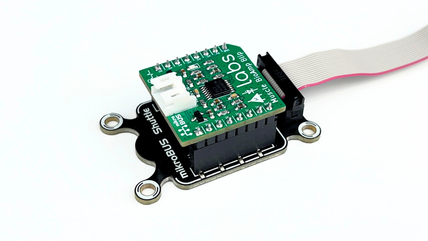 Muscle BioAmp Blip [1] adalah sensor Elektromiografi (EMG) saluran tunggal yang kompatibel dengan mikroBUS™ [2] untuk perekaman sinyal otot yang presisi. Ini memungkinkan Anda untuk menambahkan fungsi EMG ke proyek Anda dengan mudah. Anda dapat menghubungkannya ke port mikroBUS™ apa pun atau bahkan breadboard untuk memulai.