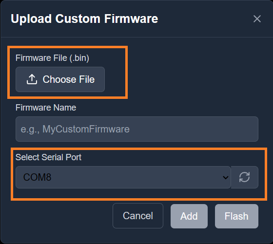 2. Klik Add, ini akan menambahkan firmware di daftar +Add Custom untuk flash di masa depan - sehingga Anda dapat melewati langkah pemilihan file lain kali.