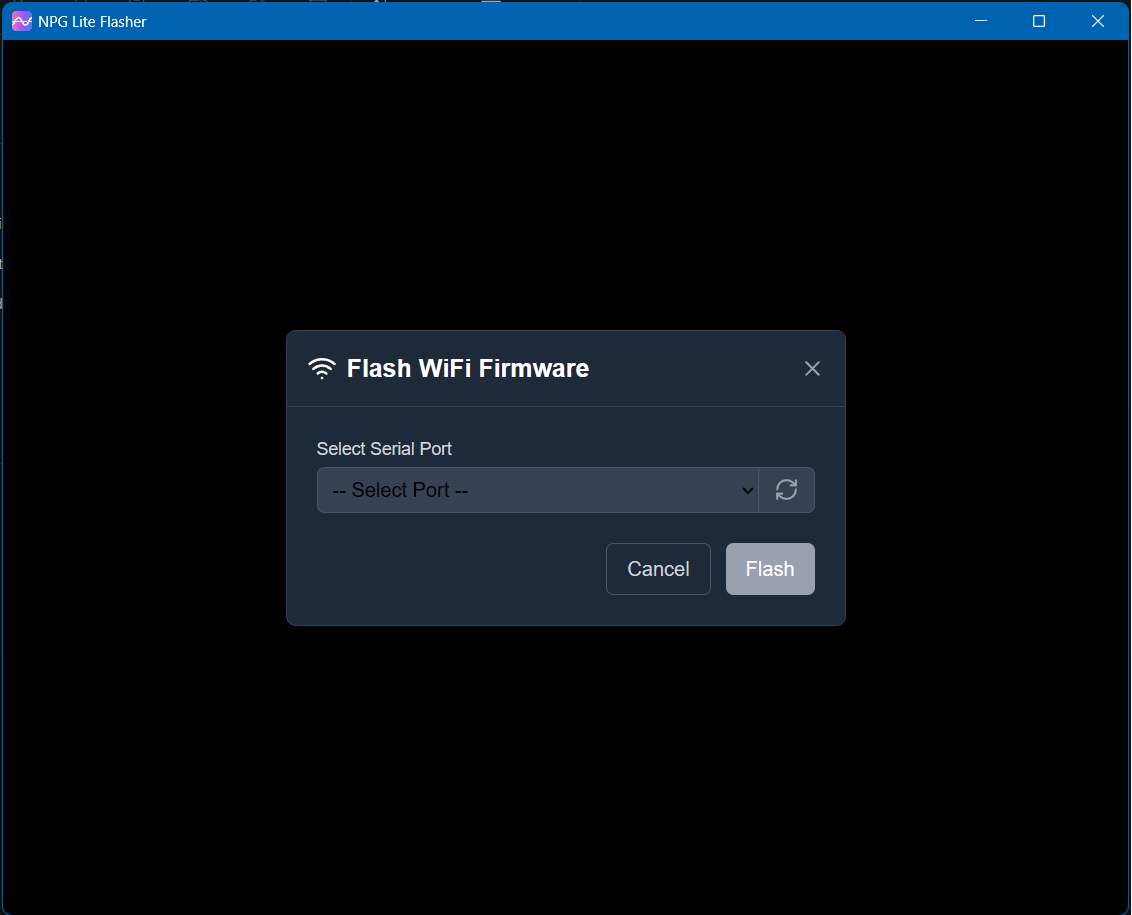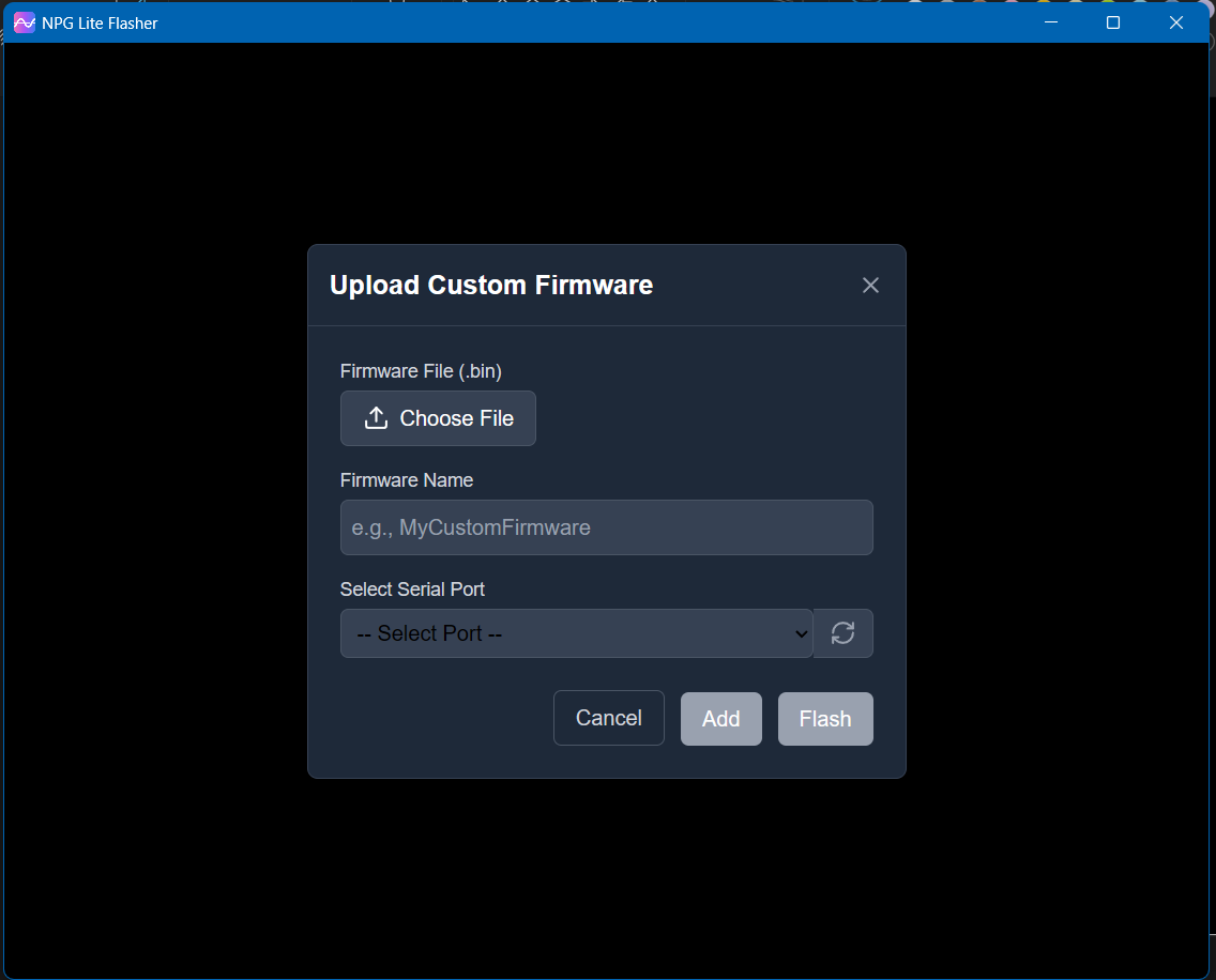 1. Setelah diunduh, layar Flash Custom Firmware akan muncul, klik Flash untuk flash firmware ke perangkat Anda. Pastikan perangkat NPG Lite Anda terhubung via USB-C. Flasher akan mendeteksi port COM serial secara otomatis. Anda juga dapat memilih port COM dari dropdown Port, sesuai dengan perangkat Anda.