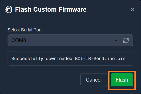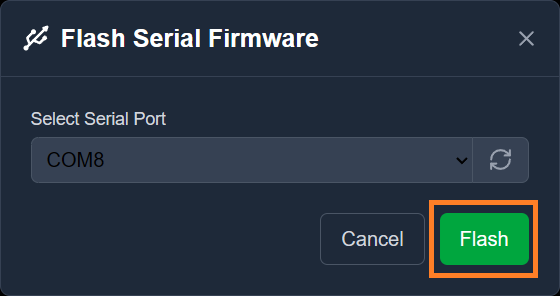 2. Klik Flash, tombol Flash untuk mulai mengunggah firmware Serial.