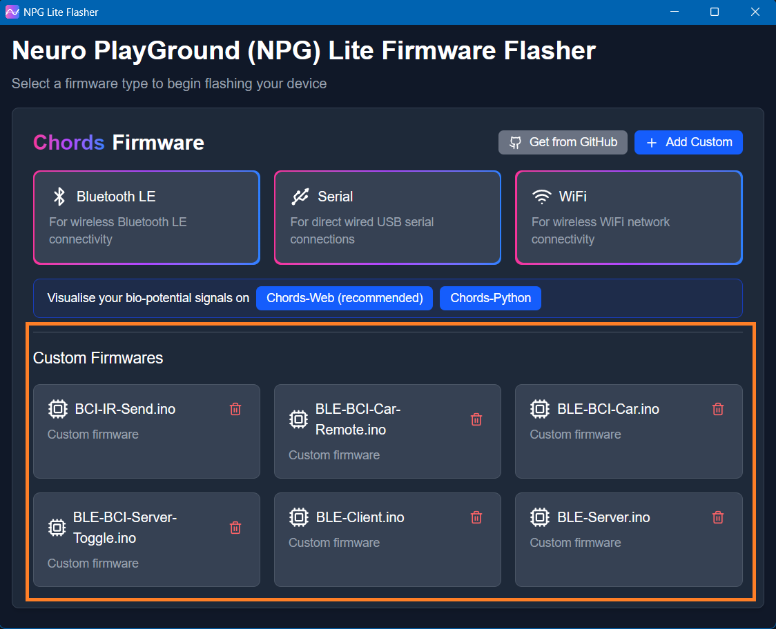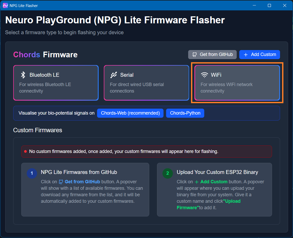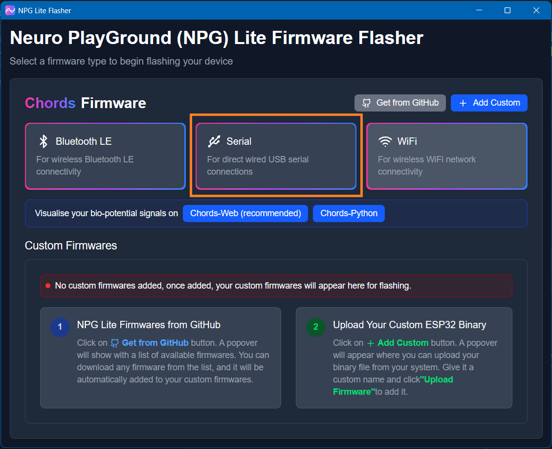 NPG Lite Flasher adalah aplikasi desktop open-source yang memungkinkan Anda untuk flash firmware ke Neuro PlayGround Lite, serta papan berbasis ESP32 lainnya menggunakan file biner. GUI yang dipoles (dan CLI) untuk mengunggah bundel firmware baru ke perangkat NPG Lite Anda (atau papan ESP32).